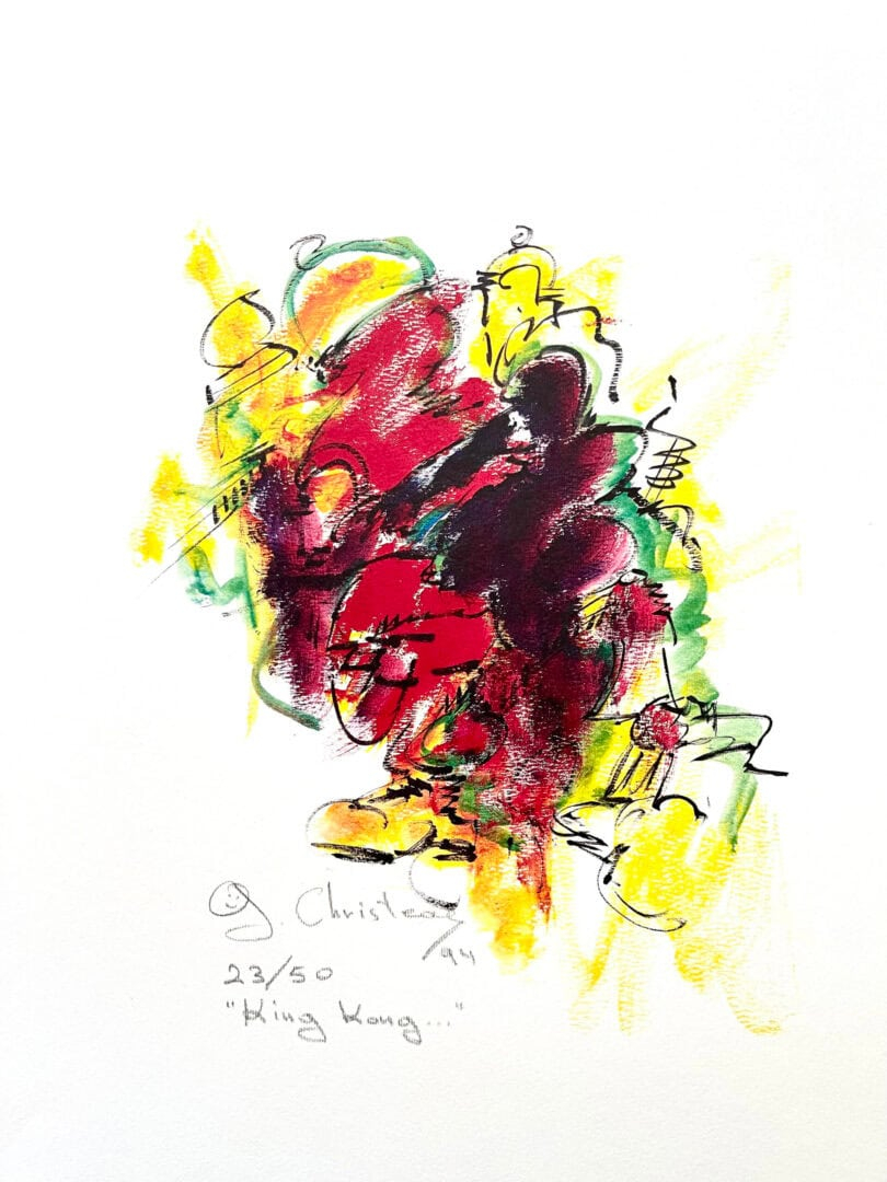 Abstract Art Prints King Kong: This art note is among my favorites in the ‘Up the Moon’ series. During a visit to Manhattan to meet my friend Agamemnon for one of our profound and philosophical discussions, New York City took center stage in our conversation that night. When I awoke the next morning, this vision flowed onto the paper – King Kong, clad in army boots, plowing through the city, with the Marshmallow Man from the movie Ghost-busters hovering above him. My deep affection for this film and New York City is the driving force behind this art note, which I consider my tribute to them.