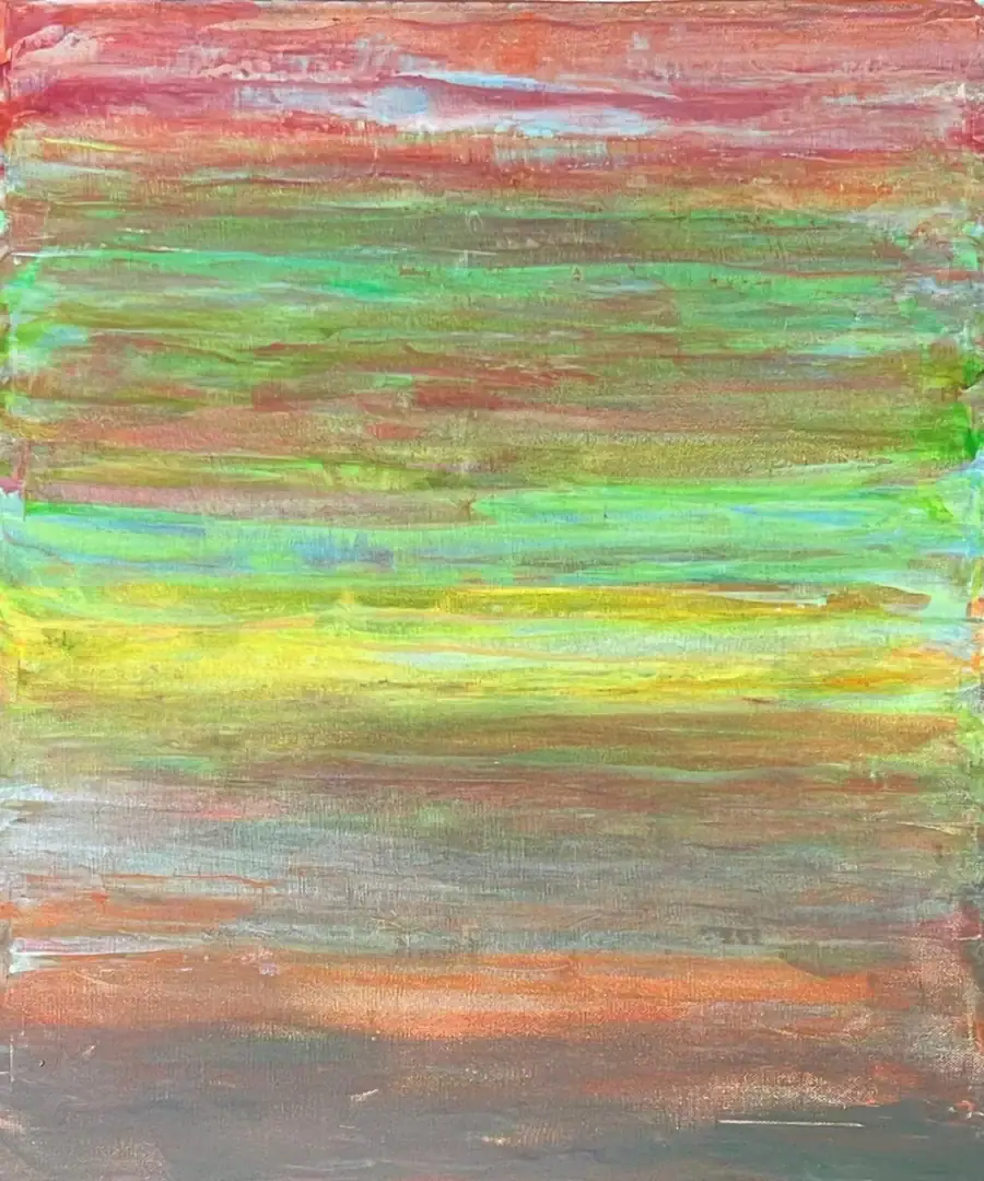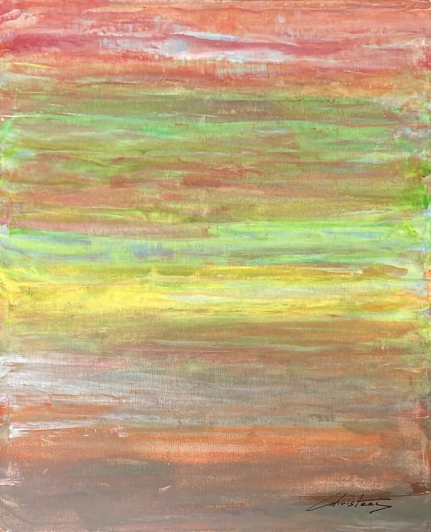 One of Christeas’ series is his abstract seascapes. These pieces capture the perpetual changes of forms and colors during sunrise over the Atlantic Ocean. A standout piece from this series is “Olakala,” a Greek word meaning “everything is OK.” This painting embodies the serene and ever-changing nature of a sunrise over the ocean, bringing Christeas peace and reassurance. Measuring 20″x24″x1.5″, “Olakala” was created using special fluorescent acrylics on canvas with a palette knife at the end of 2023.