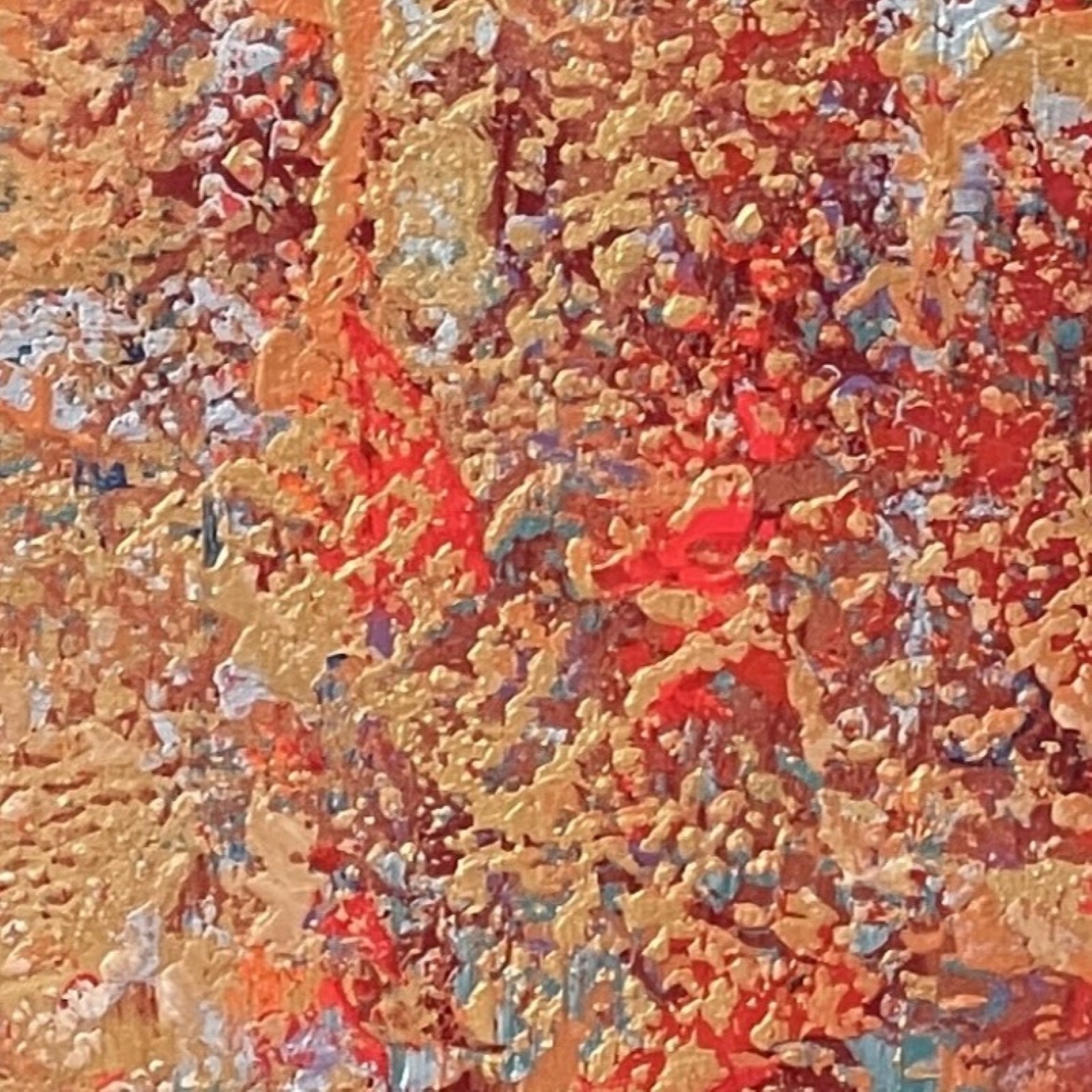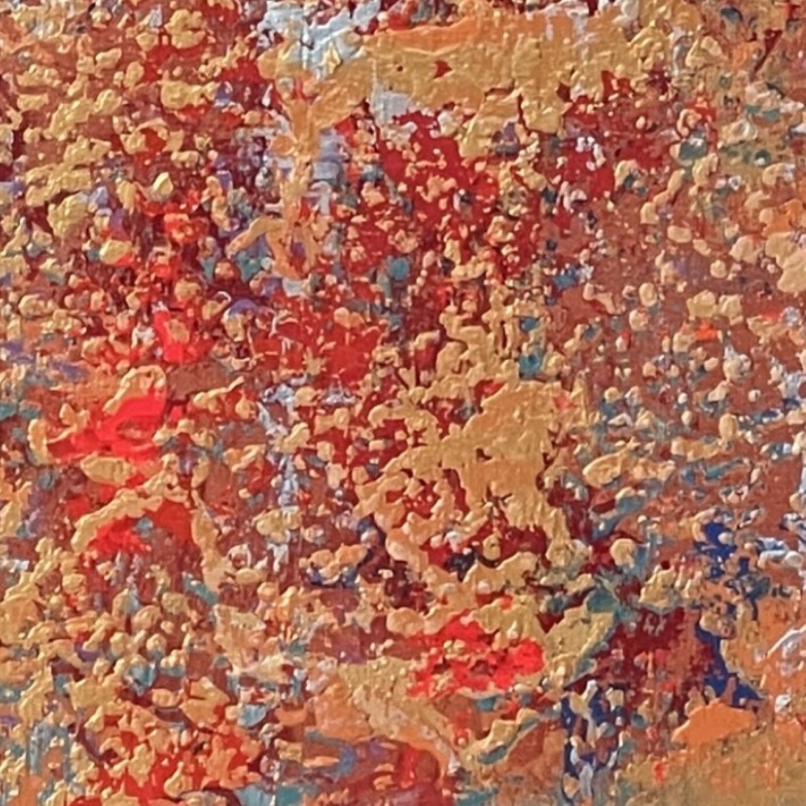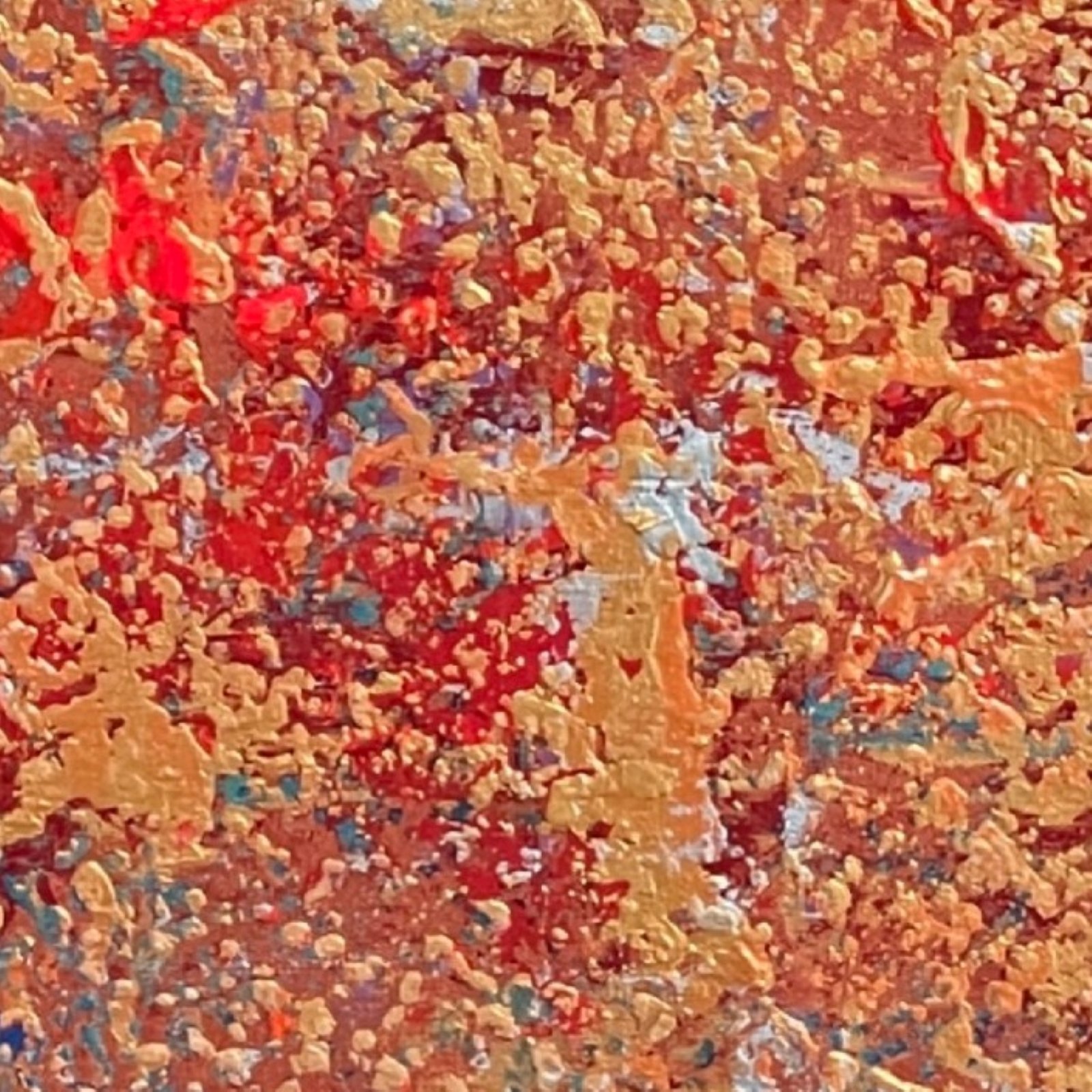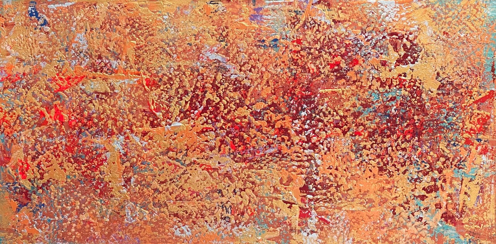 In Embers, Gregory Christeas transforms heat into memory. Layers of molten gold, copper, and deep red accumulate like geological strata, forming a surface shaped by time, pressure, and endurance. Flecks of turquoise and pale blue interrupt the warmth, offering brief moments of breath within the dense field of color.