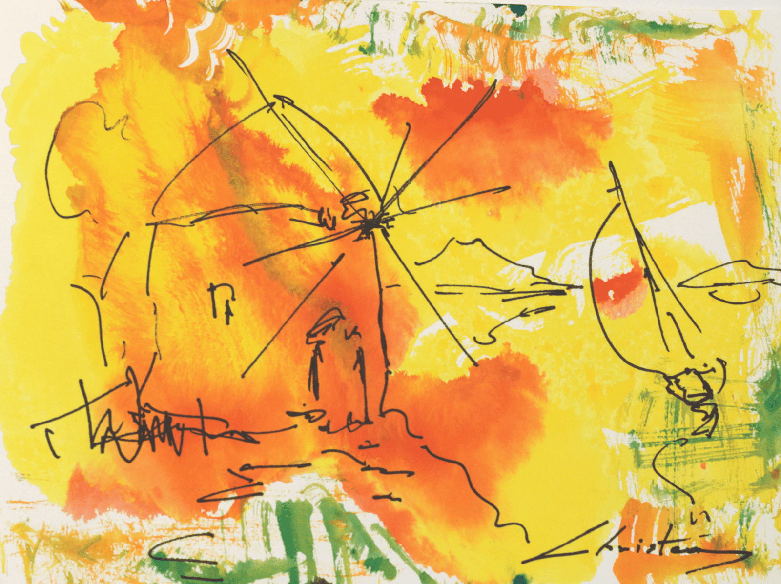 Greek Island painting by Christeas– Windmill, Hydra captures the island’s charm through bold black and vibrant inks. The expressive strokes highlight Hydra’s timeless windmill against the sea, blending architectural detail with raw emotion. This work conveys both the serenity and vitality of Greek island life in a strikingly composed piece.