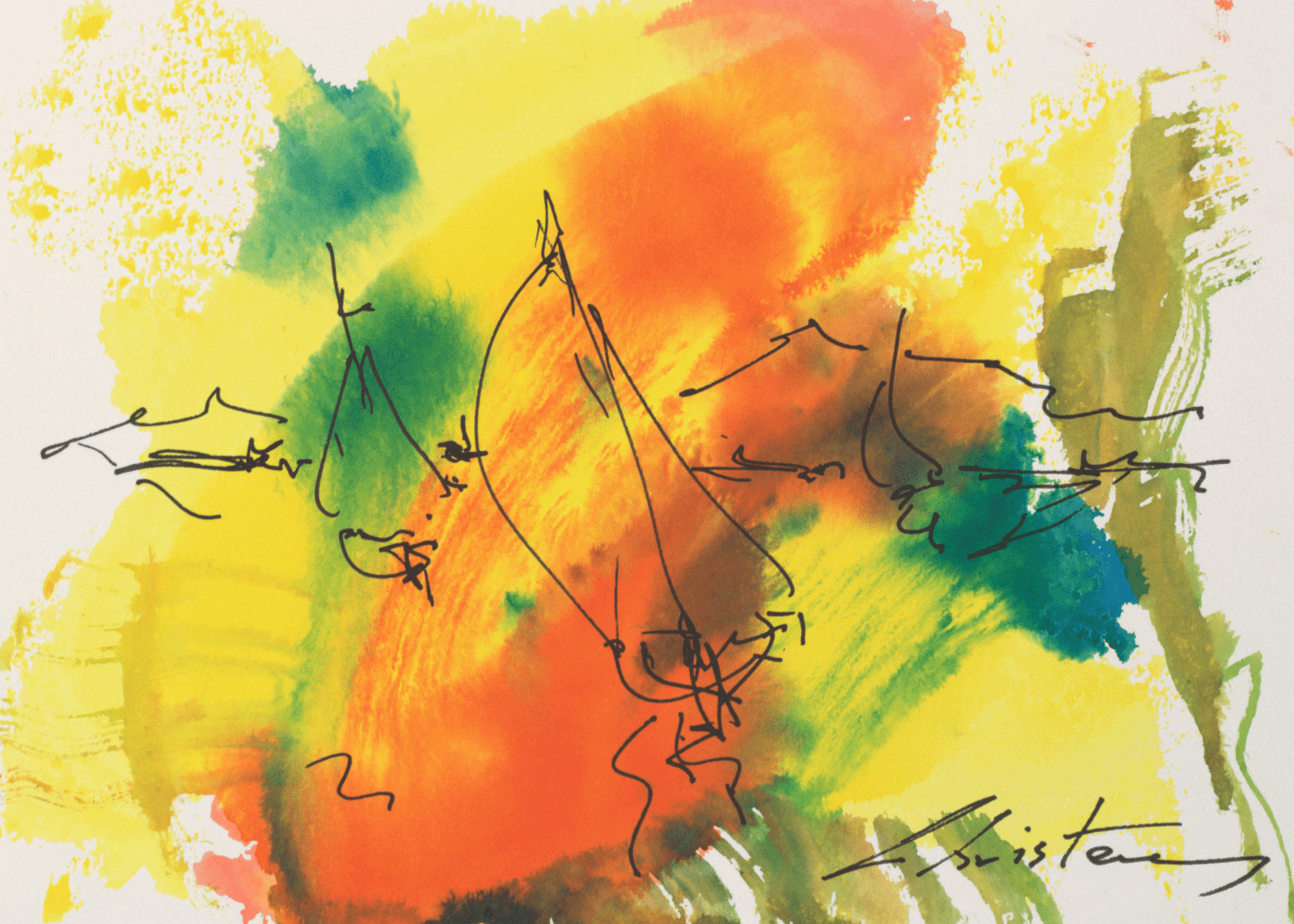 Greek Island Painting – Sunrise on Hydra. Christeas uses black and vibrant inks to capture the island’s spirit, blending detail with emotion.