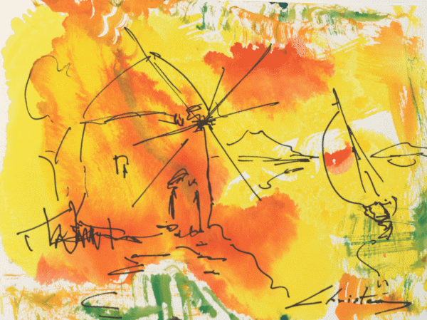 Greek Islands Windmill 9″x12″โ Windmill,ย captures the islandโs charm through bold black and vibrant inks. The expressive strokes highlight Hydraโs timeless windmill against the sea, blending architectural detail with raw emotion. This work conveys both the serenity and vitality of Greek island life in a strikingly composed piece.
