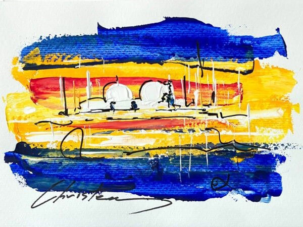 Island Aigina St. Nicholas–This original modern painting is inspired by the Church of St. Nicholas the Thalassinos, the iconic whitewashed chapel that greets every traveler arriving by sea to Aegina. Known as the protector of sailors, St. Nicholas symbolizes faith, resilience, and safe passage. Gregory Christeas captures the church’s timeless beauty and maritime spirit through color, texture, and light. A unique work that carries both the history of the island and the artist’s personal vision of Greek heritage.