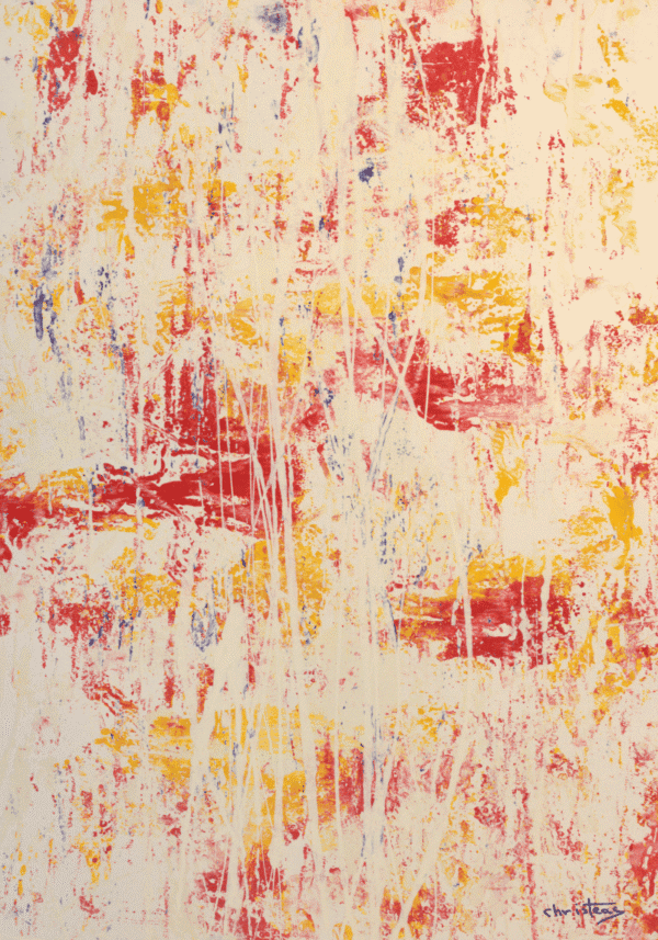 Parthenon Impressions 6–The “Impressions of the Parthenon” series by Gregory Christeas was inspired by memories of the Parthenon—a timeless symbol of light, form, and endurance. Painted with industrial oils on heavyweight paper, these works capture shifting reflections and bold abstractions that evoke both sea and stone. More than 100 paintings emerged from this vision, first exhibited at the Cultural Olympiad in Athens, 2004. Parthenon Impressions 6 engages in a dialogue between history and modernity, balancing strength with fluidity and permanence with change. Vibrant textures invite viewers to look beyond the surface, revealing emotional depth and a resonance that evolves with time and light.